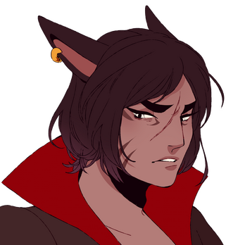 Standing tall for a miqo'te, Gae'briel sports toned muscle underneath clothing with darker colors of black and grey, coupled with some hints of gold, white and red. Partially tamed raven locks reach down to the back of his neck, longer in the back and shorter coming up to around his face. As a Keeper, his skin sports a darker hue, but not without traces of the sun's rays marking him for the years of labor spent on the docks and deck of a ship, as well as a sellsword. His striking silver eyes are often focused on the task at hand, rather than seeking any sort of conversation.He seldom speaks unless provoked, preferring to assess his surroundings first before making any kind of approach. When speaking, his dialect often reflects that of one whom has spent a lot of time among seafaring folk. Despite his often uninterested demeanor, he is quick to anger when the right buttons are pressed.Aside from the telltale preferred dark colors in the leather and cloth he wears, around his neck the man carries a handmade charm, given to him by his beloved little sister.Several cuts and faint scars litter his body from years spent in combat, but none are as noteworthy as the scar that runs vertical across the bridge of his nose and between his eyes. Aside from clan markings, he carries few other distinguishing marks.The way in which he speaks changes depending on the company he is with. His voice is often gruff, but when around those he is comfortable with, he speaks with a kinder, more caring tone. Around all others, he is often short of words, and prefers to speak as few as possible in order to end conversations he finds no benefit in.Gae'briel's cold personality is often difficult to approach except for those who either know how to navigate the waters, or know what buttons are best pressed to illicit a reaction. When provoked, he is harsh and crude in tone, but a night and day difference when it comes to those he shares some level of trust with. For those rare few, he is kinder in tone and mannerisms, though often still referred to as a grump.He smiles little, save when in the company of those he's more familiar and comfortable with. Otherwise, he often wears a look of indifference, or a scowl, with little care for putting on a front for others.Despite his cold mannerisms, he is fiercely loyal to those he feels a companionship with akin to family.